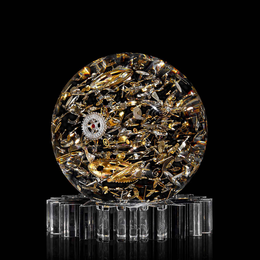Masterminds in freezing time, Berd Vay’e offers an exclusive look into the secret inner-workings of watchmaking through its show-stopping, limited edition sculptures. Each and every gear, barrel, wheel, spring, escapement wheel, pinion, bridge, and hands is storied. Components are restored, polished and meticulously positioned, balanced in precious, crystal clear shatter-resistant Lucite®.
