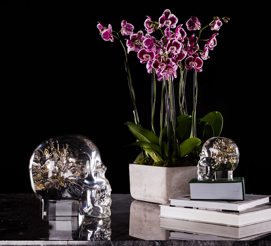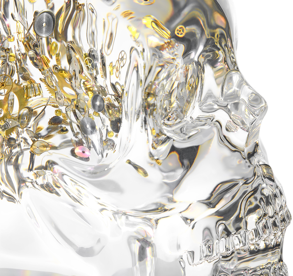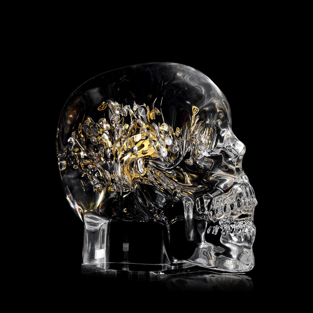 Design-forward modern art. Watch components are meticulously placed to emote humanity and the power of the mind in our flagship creation. The components symbolically represent the complex inner workings of the mind. The skull is a steadfast reminder that time is precious and not forever.