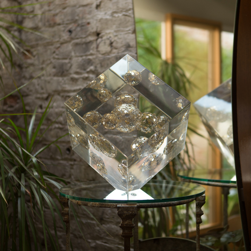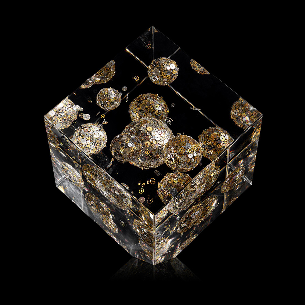 Galaxy is composed of a "universe" of miniature orb sculptures, seeming floating within a secondary exterior piece – a formidable and translucent cube of precious Lucite®.