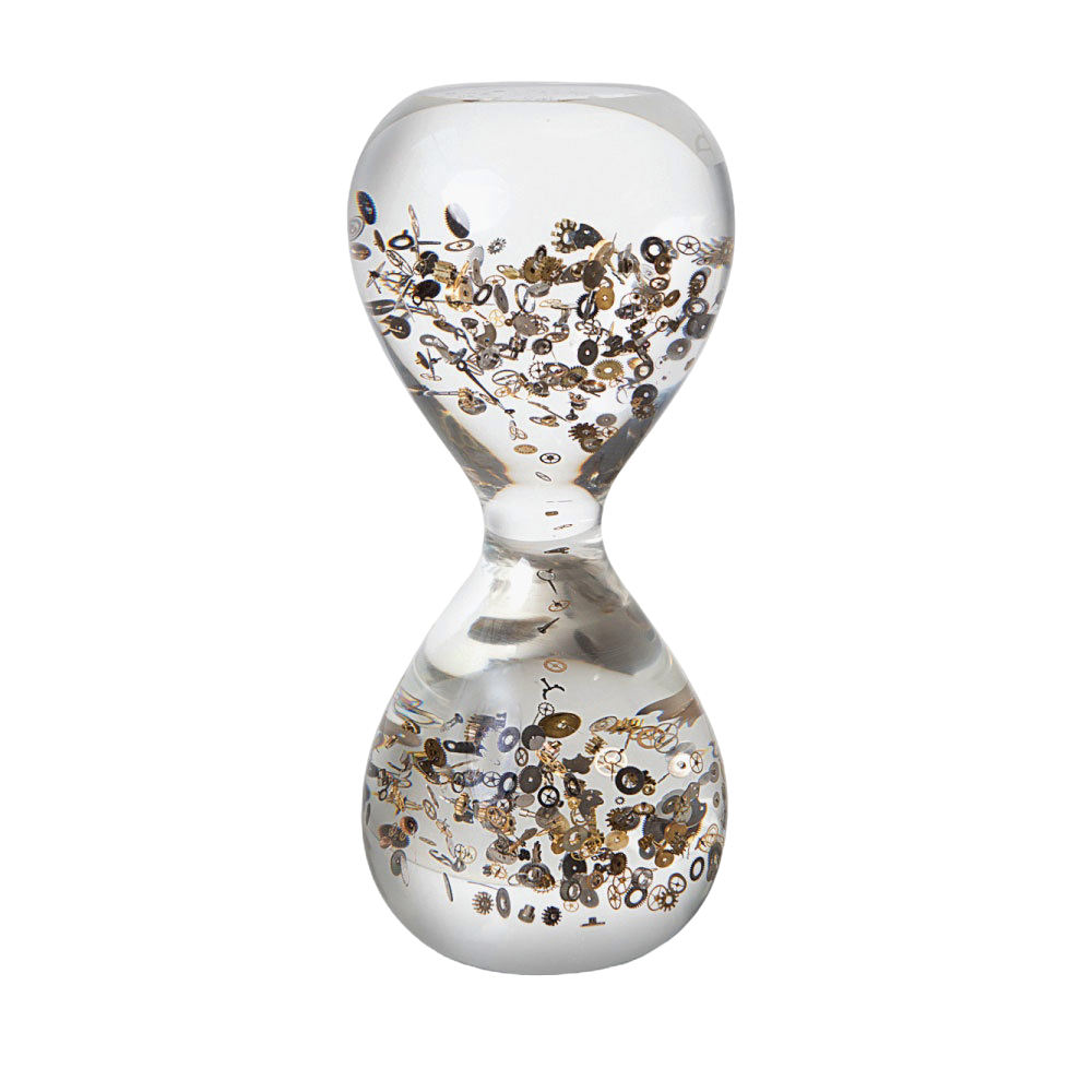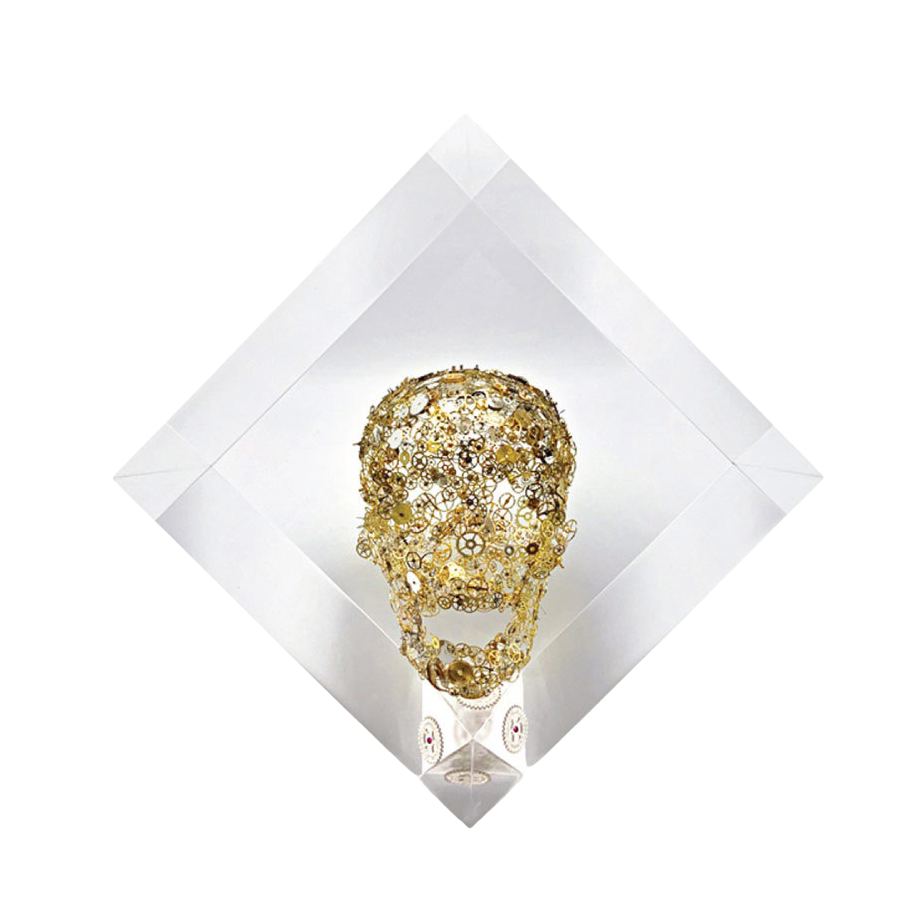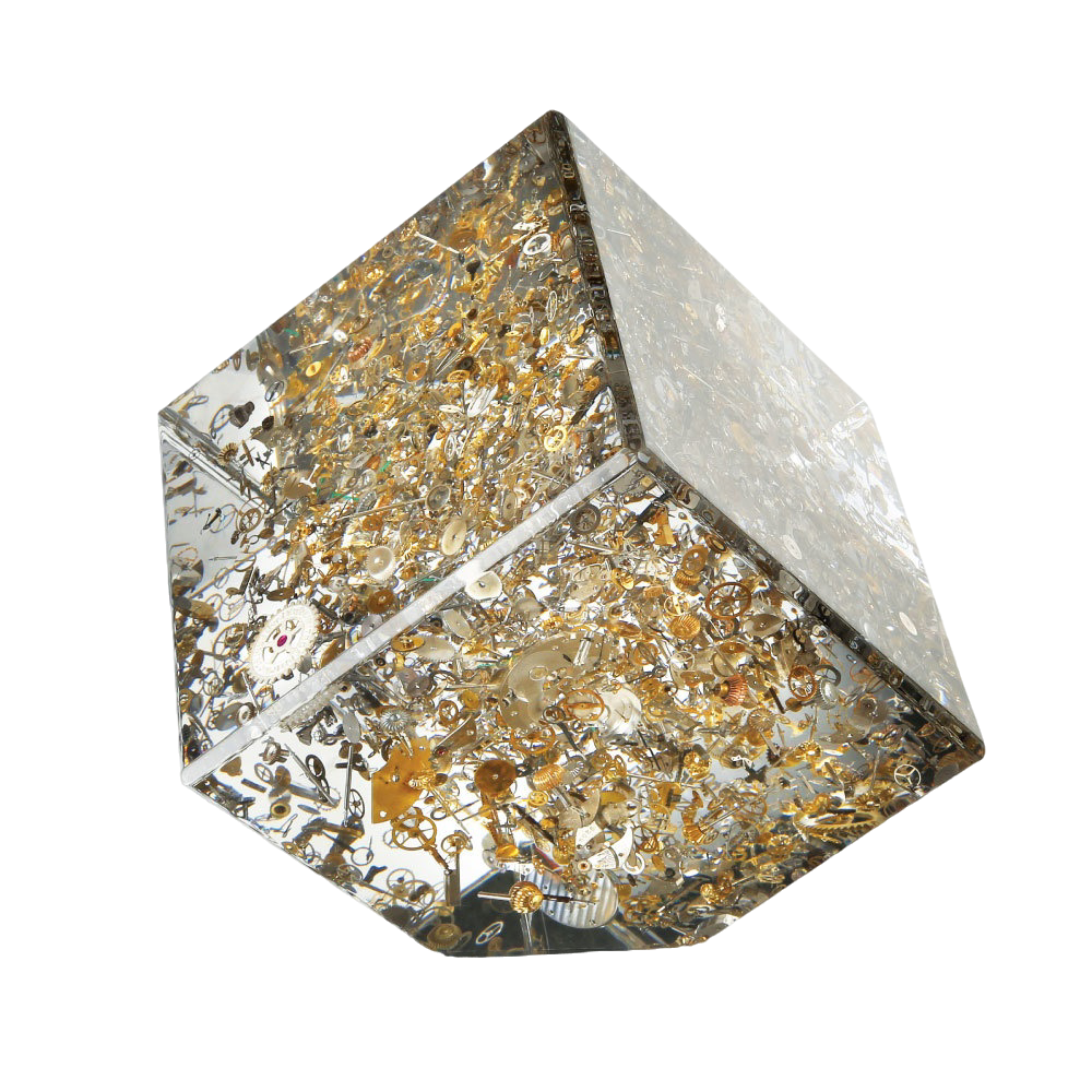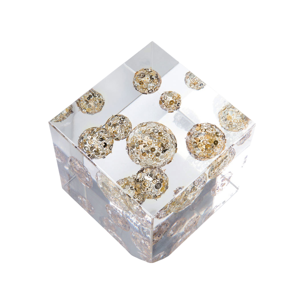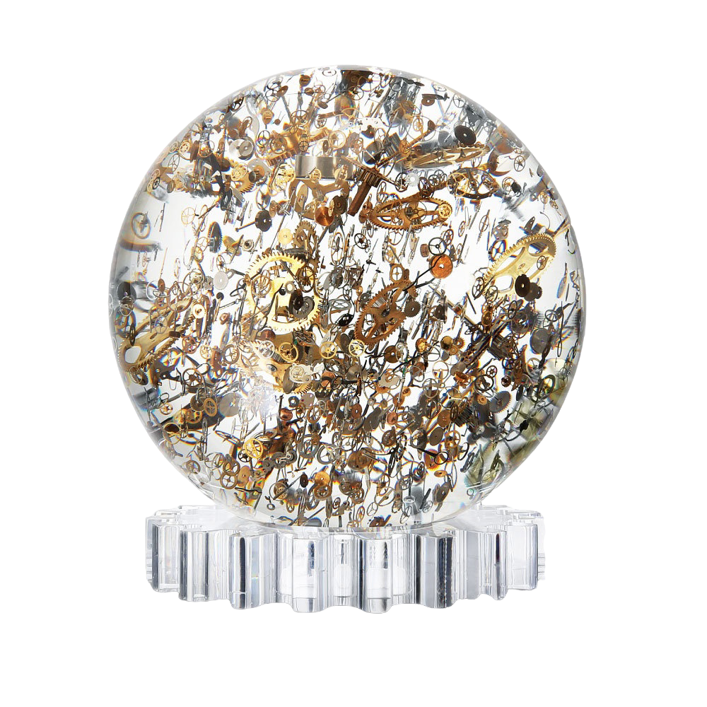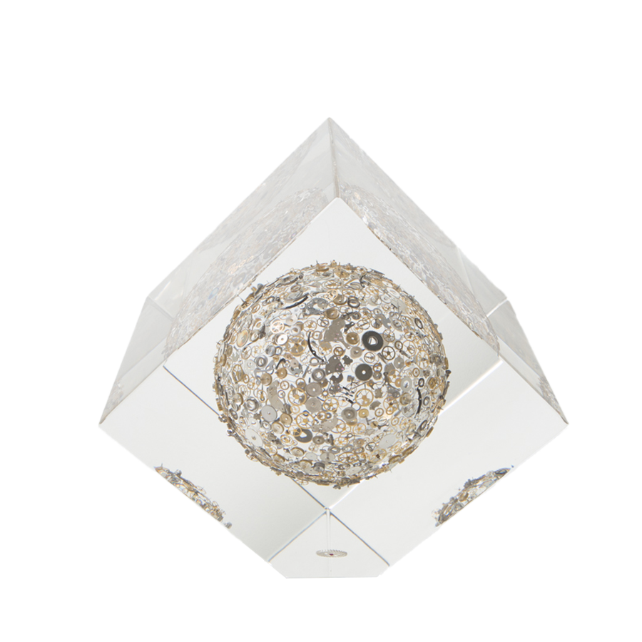 A marvel in suspension. A transcendant horosphere encrusted with vintage watch parts seemingly oats within an encompassing angular cube. The crystal clear Lucite structure rests curiously on its corne...