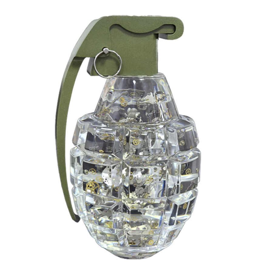 Encased in transparent Lucide crystal, this enigmatic creation takes the form of a grenade, yet exudes an elegance far beyond its typical purpose. The translucent Lucide gleams with multifaceted brill...