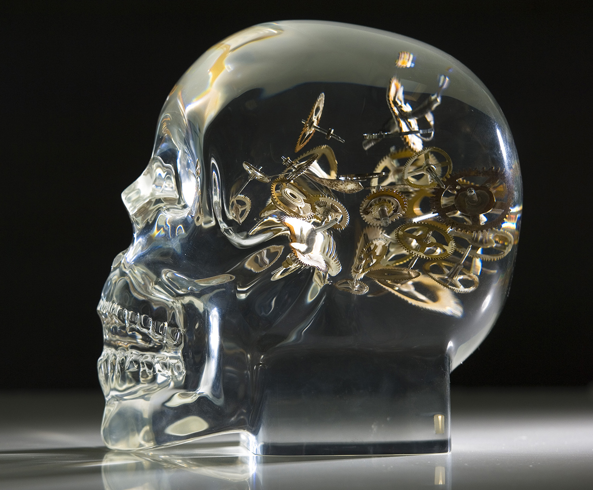 Design-forward modern art. Watch components are meticulously placed to emote humanity and the power of the mind in our flagship creation. The components symbolically represent the complex inner workings of the mind. The skull is a steadfast reminder that time is precious and not forever.